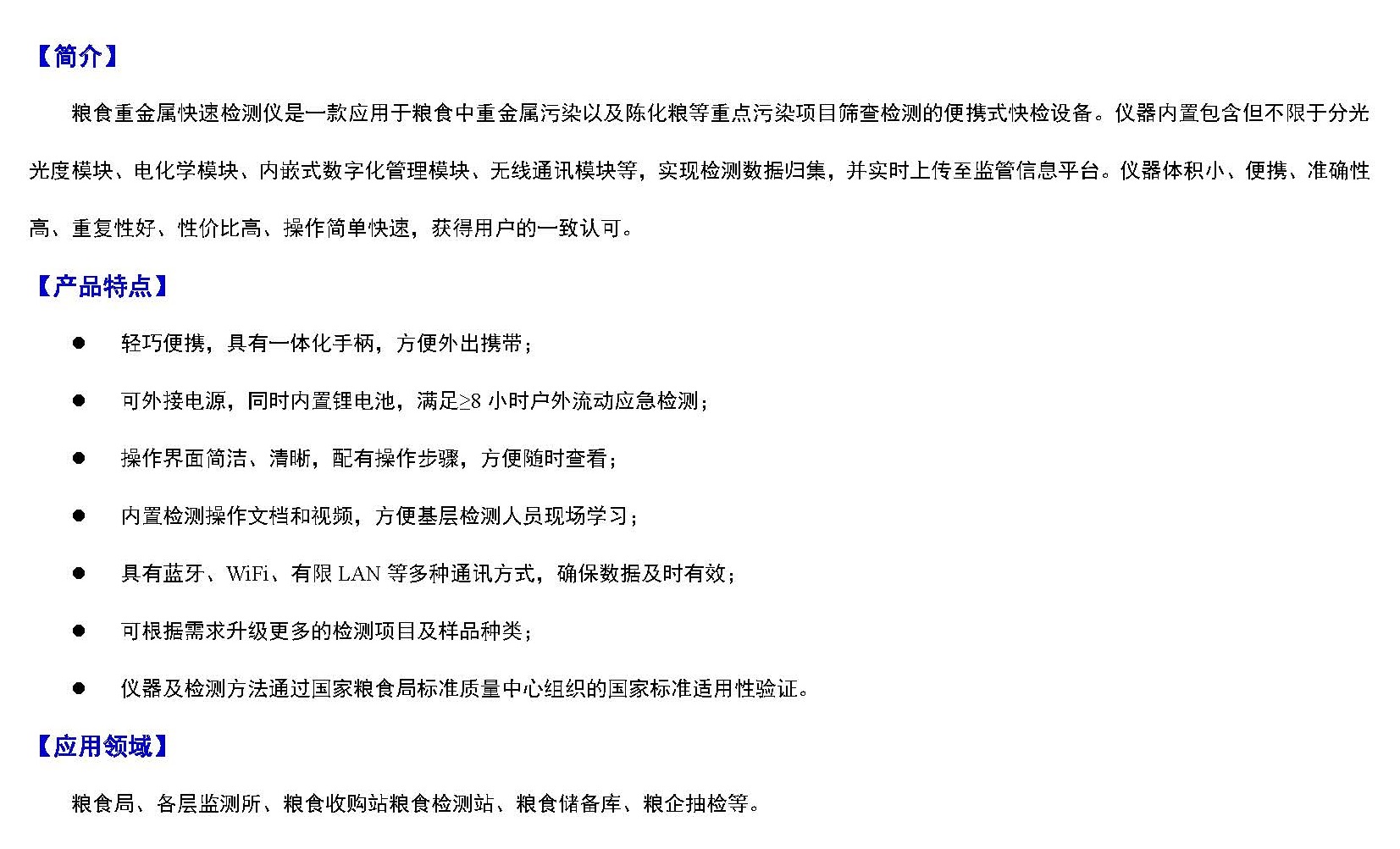 糧食重金屬快速檢測(cè)儀是一款應用於糧食中重金屬汙(wū)染以及陳化糧等重點汙染(rǎn)項目篩(shāi)查檢測的便攜式快檢設備。儀器內置包含但不限於分(fèn)光(guāng)光度模塊、電(diàn)化學模塊、內(nèi)嵌式數(shù)字化管(guǎn)理模塊、無線通訊模塊等,實現檢測數據歸集,並實時上(shàng)傳至監管信息平台。儀器體積小、便攜、準(zhǔn)確性高、重(chóng)複性好、性價比高、操作簡單快(kuài)速,獲得用(yòng)戶的一致(zhì)認可。