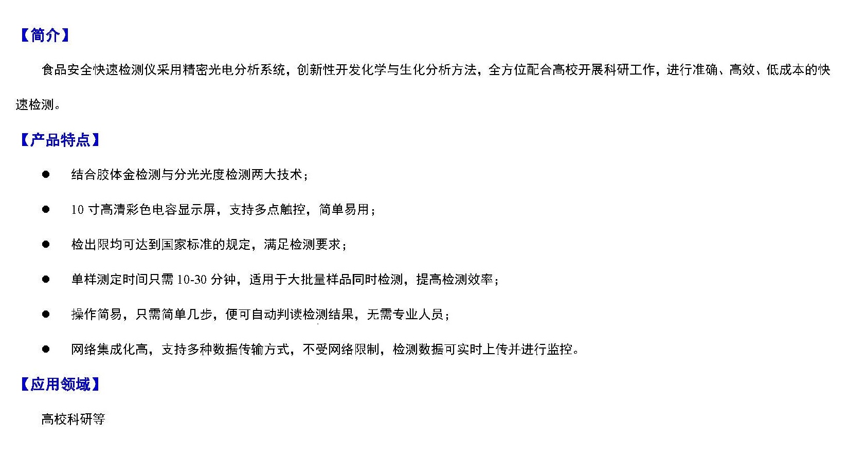 食品安全快(kuài)速檢測儀采用精密光電分析係統,創新性開發化學與生化(huà)分析方法,全方(fāng)位(wèi)配合高校開展科研工作,進行準確、高效、低成本的快速(sù)檢測。