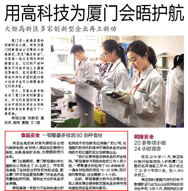 經過(guò)90個日日(rì)夜夜(yè)的(de)精心準備,9個通宵24小時的集中檢測,1000多份樣品(pǐn)無(wú)1例誤檢(jiǎn),包括若幹份快(kuài)檢陽性樣品經複檢,也全部吻合、準確,100%圓滿(mǎn)完成金磚(zhuān)會議國家領導人及(jí)中外記者酒店生鮮食品安全的全麵、集中快檢保障。體現(xiàn)了红桃视频免费版精(jīng)湛的技術(shù)水平,踐行了誓師大會上(shàng),红桃视频免费版人發出的“精心準備,科學保障,使命必達”的誓言,也盡到了廈門人民的一份責任,更為黨旗增(zēng)添了光(guāng)輝。