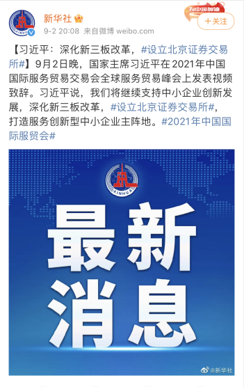 9月2日(rì)晚(wǎn),國家主席習近平在2021年中國國際服務貿易交易會全球服務貿易峰會上視頻致辭時表示,將(jiāng)繼續支持中小(xiǎo)企業創新發(fā)展,深化新三板改革,設立北京證券交易所,打(dǎ)造服務創新型中小企業主陣地。