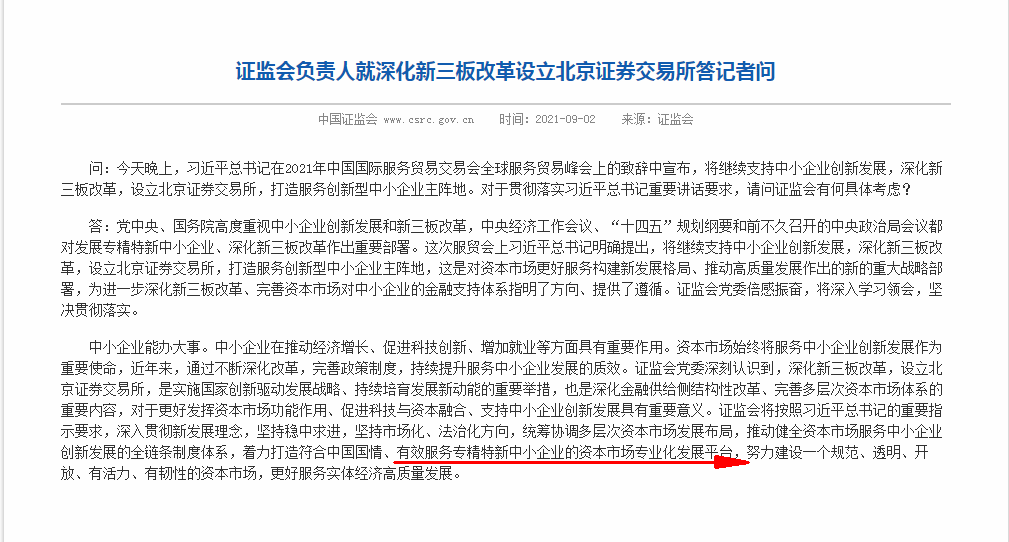 值得一提的是,證(zhèng)監(jiān)會負(fù)責人就深化新三板改革設立北京證券(quàn)交易所答記者問時表示,將統籌協調多(duō)層次資本(běn)市場發展布局,推動健全資本市場服務中小企業創新發展的全鏈條製度體係,著力打造(zào)符合中國國情、有效服務專精特新中小企業的資本市(shì)場專(zhuān)業化發展平台。