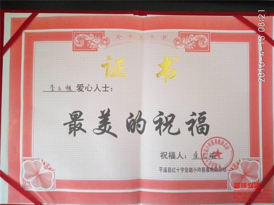 2016年山西超躍安防董事長李立根先生參加平遙縣紅十字會趙曉玲慈(cí)善救助,而被救助人回饋給李董事(shì)長愛心人士證書,大愛在人(rén)間。讓草莓樱桃丝瓜绿巨人秋葵榴莲大全對愛心人(rén)士點個讚(zàn)!!!