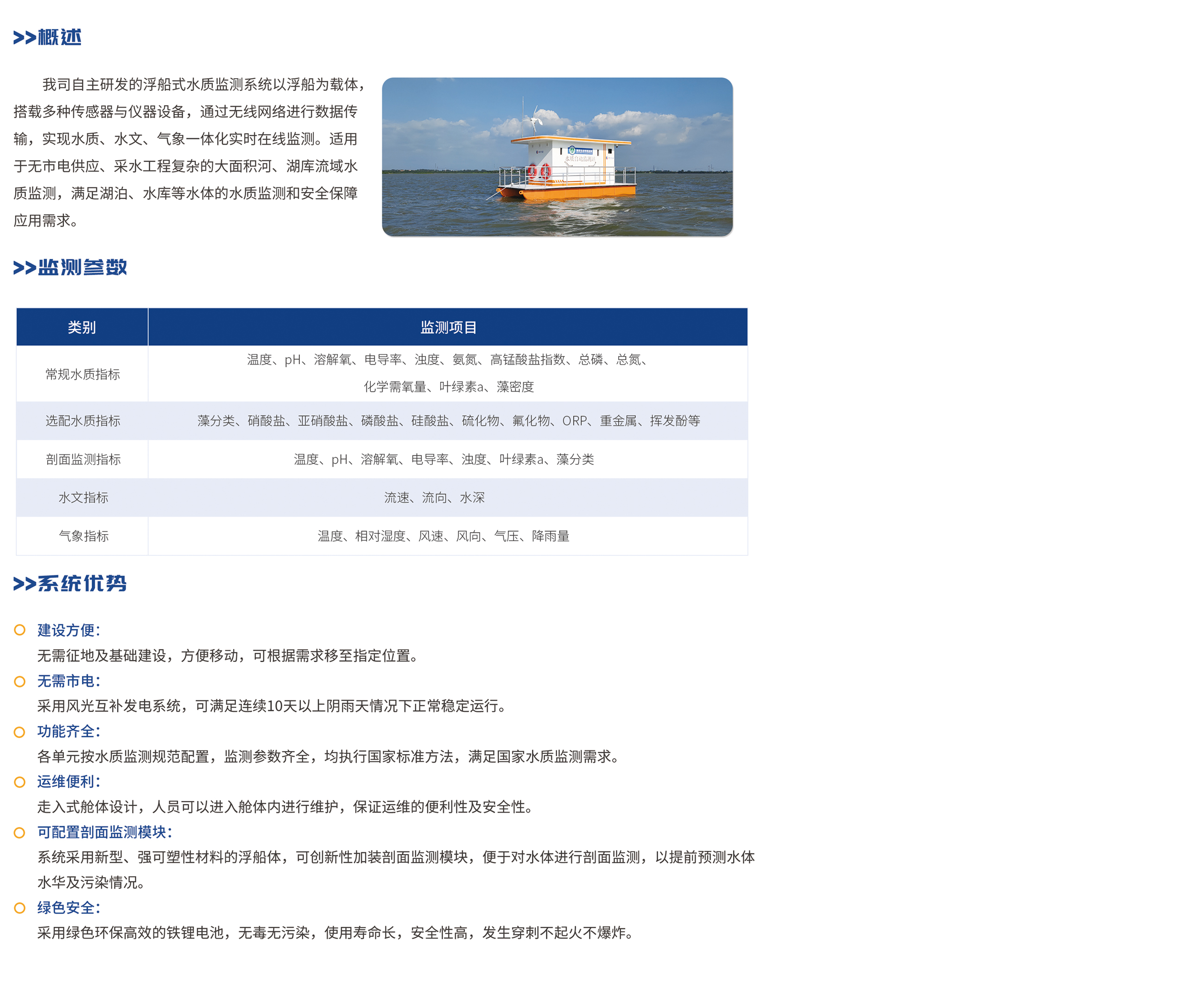 我司(sī)自主(zhǔ)研發的浮船(chuán)式水質監(jiān)測係統以浮船為載體,搭載多種傳感器與儀器設備,通過無線網絡進行(háng)數(shù)據(jù)傳輸,實現水質、水(shuǐ)文(wén)、氣象一體化實時在線監測。適用於無市電(diàn)供應、采水工程複雜的大麵積河、湖庫流域水(shuǐ)質監測,滿(mǎn)足湖泊、水庫等水體的水(shuǐ)質監測和安全保障應用需求。
